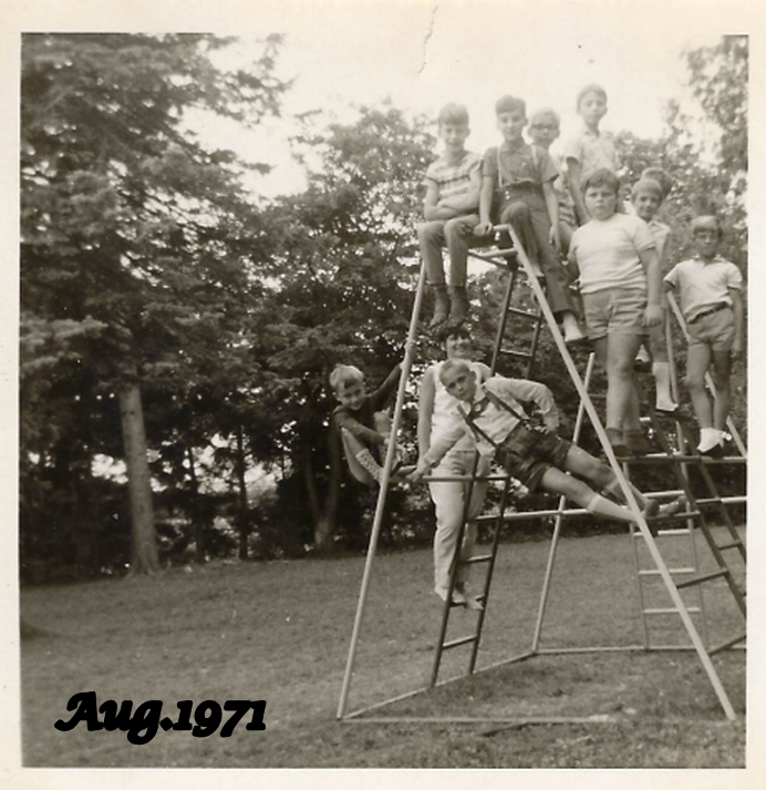 Ich erinnere mich auch noch daran, dass auf dem "Spielplatz", den wir nie benutzen durften, ein Klettergerüst stand. Aber eines Tages sollten sich immer ein Teil unserer Gruppe irgendwie an dem Klettergerüst festhalten und dann in die Kamera lachen (man beachte die "fröhlichen" Gesichter der Kinder auf dem Foto).