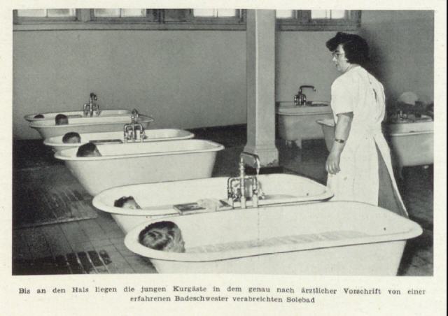 Sehr beliebt bei den Tanten waren auch Solebäder, das sind Badewannen (Kindergröße) voll mit lauwarmen bis kaltem Salzwasser. Die Wanne wurde so voll gemacht, dass einem das Wasser bis zum Kinn stand.